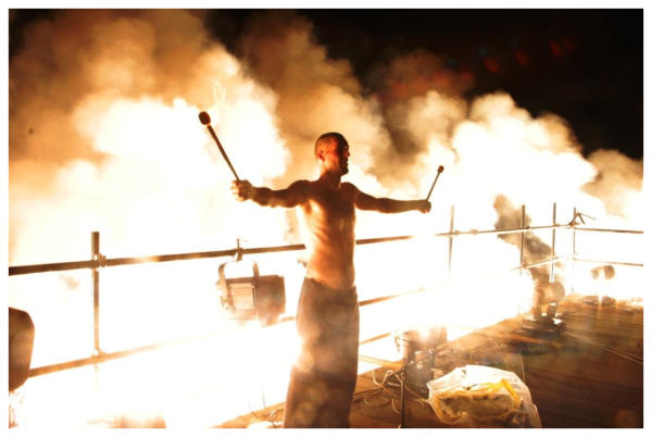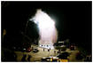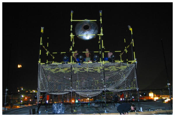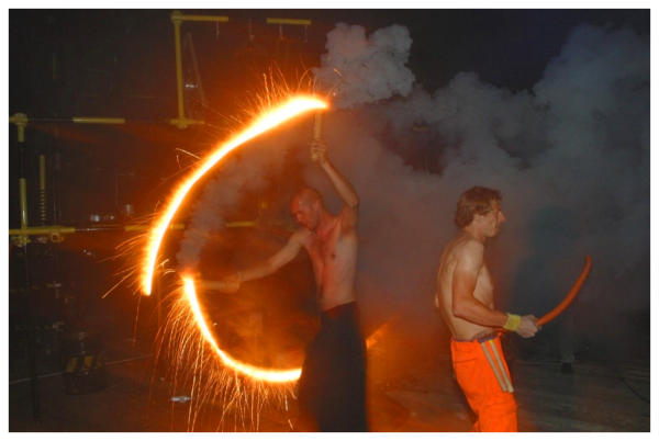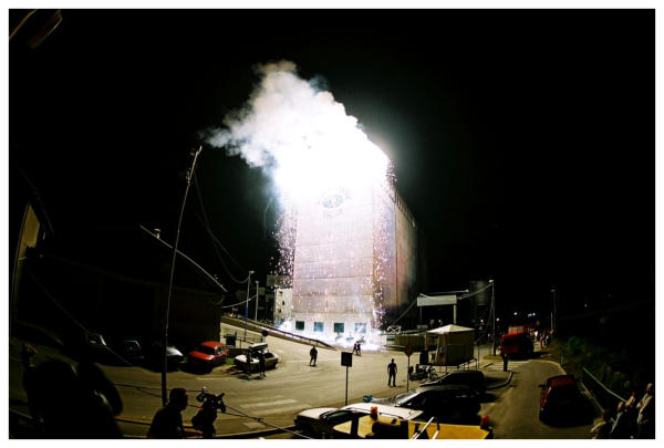SLADARNA, LAŠKO 2004In summer 2004 The Stroj performed on the roof of the highest building of Laško brewery in Slovenia. Huge spectacle with impressive lightning and pyrotechnic effects was one of the most challenging projects of The Stroj insofar. Photo: Borut Krajnc and Jurij Vižintin