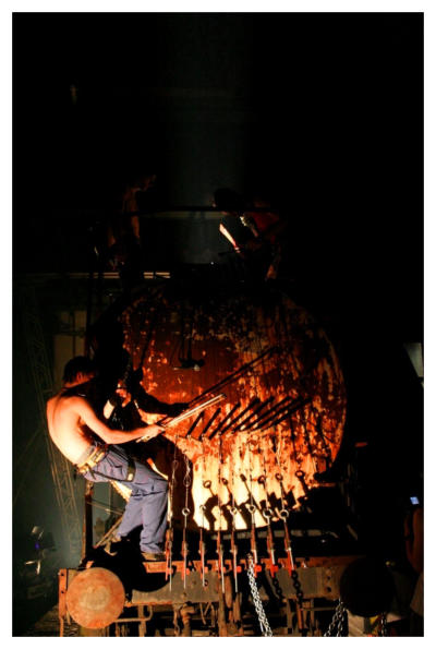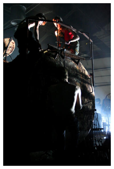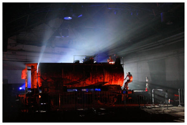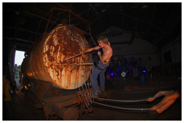 RAILWAY MUSEUM, LJUBLJANA 2006In June 2006 The Stroj released their 3rd album 'Cona / The Zone'. The main promotional event was held in Railway Museum Ljubljana, one of the most impressive industrial heritage buildings in Slovenia. For this special event The Stroj crew also modified an old railway cistern and used it as an giant instrument with strings and percoussions inside. Photo: Silvo Privšek and BAX